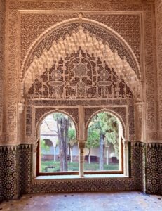 The next morning, we drove up the hill above the town to the Alhambra. Our first stop was the unfinished Renaissance palace built by Charles V, beside the Alhambra. At the entrance to the Nasrid palaces, we had to show our timed tickets and passports. Our local guide, who was both knowledgeable and humorous, led us through the different parts of the Alhambra complex, explaining the main features of the Courtyard of the Myrtles, Hall of the Ambassadors, Courtyard of Lions, and the King’s living rooms with their intricately carved columns, magnificent ceilings, and window niche carvings — an overwhelming display of Islamic art, more than I could take in during a walk-through. I wanted to return and spend a few hours examining the carvings more closely. We were also shown Washington Irving’s room. His book, “Tales of the Alhambra,” which I was reading, rekindled interest in the complex.