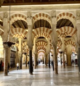 The next morning, our coach took us to Córdoba, about a two-hour drive away. We stopped to explore the Mezquita, a massive former mosque that once stood at the heart of Islam in Andalusia, comparable in cultural importance to Baghdad. About a hundred years after the fall of the Caliphate of Córdoba, the mosque was dedicated as a Catholic church, with structures added over the following centuries, including the impressive tower built atop the minaret. The large space, supported by decorated arches, features a Mihrab and an altar. From an area with a glass-covered floor, you can see the earlier Visigothic ruins. Córdoba was home to philosophers such as Maimonides, Averroes, and Seneca.