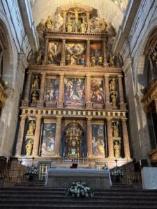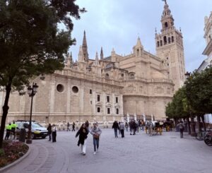 The next day, we were given a tour of Seville’s main sites, including the Plaza de España, built for the 1929 World’s Fair, where the colorfully tiled scenes and maps of every province are presented in a semicircular arc at the foot of the imposing main pavilion. We walked through Barrio Santa Cruz, formerly the Jewish neighborhood, with its narrow lanes and small plazas, more reminiscent of my visit decades ago. The main sites were the Royal Alcazar, a Moorish Palace repurposed for later Christian kings, but retaining its Islamic architecture, carvings, and gardens. Nearby, the largest and ornate Gothic Cathedral, with a massive bell tower that is a repurposed minaret, housed the tomb of Christopher Columbus. More time and explanation to appreciate these sites would have been welcome.