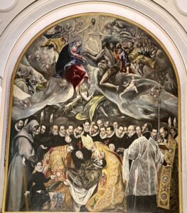 The drive to Toledo the next morning took over an hour, slowed by the rush hour in Madrid. Our coach dropped us off near a bridge over the Tagus River, which led to a winding, narrow road through the Jewish quarter of small dwellings. Toledo became a “Taifa” after the collapse of the Cordoba Caliphate and remained important after coming under Christian rule in 1085, while still hospitable to Jewish and Muslim influences. It is now the capital of the Castilla— La Mancha province and was home to Cervantes and El Greco. It has a massive Gothic cathedral, is the birthplace of Manchego Cheese, and is a UNESCO World Heritage Site.