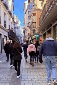 Back on our bus, it took about four hours to reach Granada. The rolling landscape was mainly covered with olive trees, with a few patches of vineyards or fallow land. The snow-capped, majestic Sierra Nevada appeared as we approached Granada. After checking into our modern hotel, I was eager to stretch my legs after hours of sitting. I asked the hotel for directions to the city center. I walked along the main road for about twenty-five minutes, and then I noticed a hub of activity. I entered Castaneda, an energetic place bustling with people of all ages. It had legs of ham hanging from hooks above the bar. In broken Spanish, I ordered red wine, which was served with tapas, a tortilla. I tried to engage my neighbor in conversation, but he said he didn’t speak English or wasn’t interested. Anyway, I was content to be a bystander, listening to the animated banter around me. As I left, I noticed the narrow road above and parallel to the main road. It turned out to be at the heart of the old town, with small shops of all kinds lining the street. I passed a few boutique hotels along the way and wished we were staying in one.